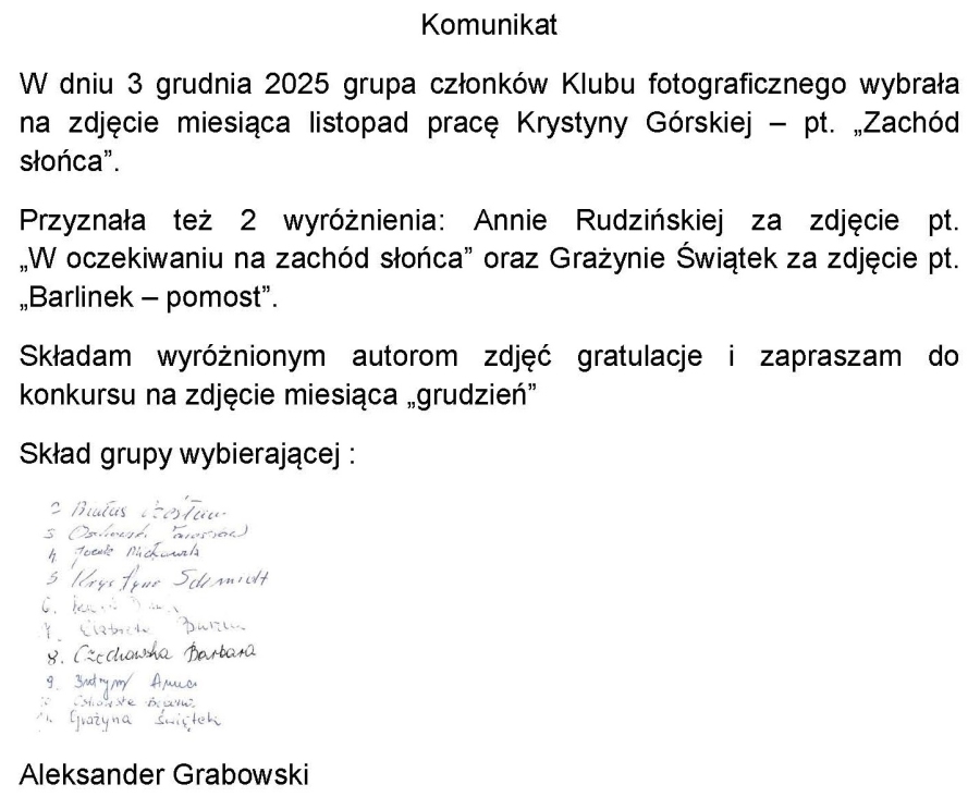 Komisja w składzie: instruktor fotografii Sławek Szajkowski i 4 uczestników sekcji fotograficznej MDK w dniu 10.10.2025 r. wybrała na zdjęcie miesiąca „październik” zdjęcie „Panorama z okna”, którego autorem jest Aleksander Grabowski oraz przyznała wyróżnienia za zdjęcie „Jasień” autorstwa Czesława Białasa i za zdjęcie „Prześwity”, którego autorem jest Patryk Lewandowski.